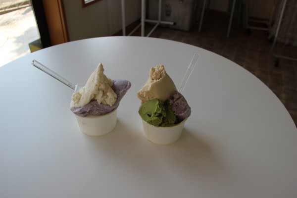 ジェラート(左は上から落花生、ブルーベリー、ホワイト。右はカプチーノ、抹茶、ブルーベリー)